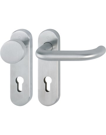 HOPPE Wechselgarnitur Paris FS-E58/353KH/138; Produkttyp: Wechselgarnitur; Produkttyp (Hersteller): Wechselgarnitur; Ausführung: Kurzschild; Befestigungsart: verdeckt verschraubt; Befestigungstechnik: mit Stütznocken; Form: oval; Vierkant: 9 mm; Material: Edelstahl; Material Unterkonstruktion: Stahl; Form Türgriff (innen): U-Form; Form Türgriff (außen): Flachknopf; Ausführung Türgriff (außen): fest; Gewinde Knopf/Griffplatte: M12; Durchmesser Türgriff (außen): 50 mm; Länge Türgriff (innen): 141 mm; Höhe Türgriff (innen): 69 mm; Höhe Türgriff (außen): 32 mm; Schildbreite außen: 44 mm; Schildbreite innen: 44 mm; Schildlänge außen: 165 mm; Schildlänge innen: 165 mm; Schildstärke außen: 10 mm; Schildstärke innen: 10 mm; Lagerung: festdrehbar,wartungsfreies Gleitlager,mit Rückholfeder; Einsatzbereich: Objekttür; Türart: Vollblatt; Türwerkstoff: Holz,Stahl; Norm: DIN 18273,DIN EN 1906; Zulassung: für Feuerschutz,für Rauchschutz; Lochung: Profilzylinder gelocht; Entfernung: 72 mm; DIN-Richtung: DIN Links-Rechts; Farbe: grau; Farbton: edelstahl matt; Ausführung Vierkant: Rollenwechselstift; Türstärke min.: 40 mm; Türstärke max.: 65 mm
