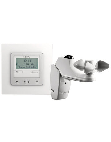Wind- und Sonnenautomatik mit kabelgebundenem Wind-Sonnensensor.